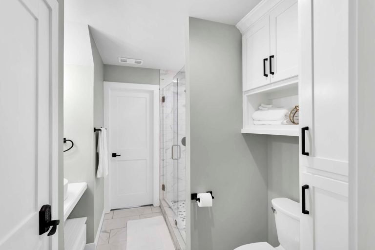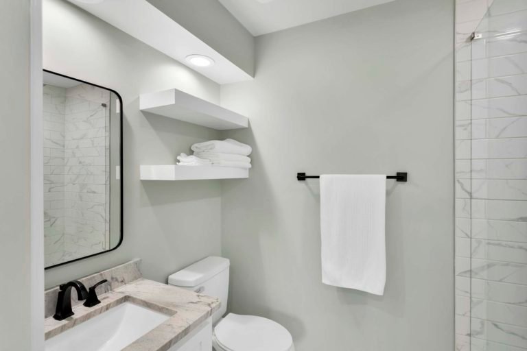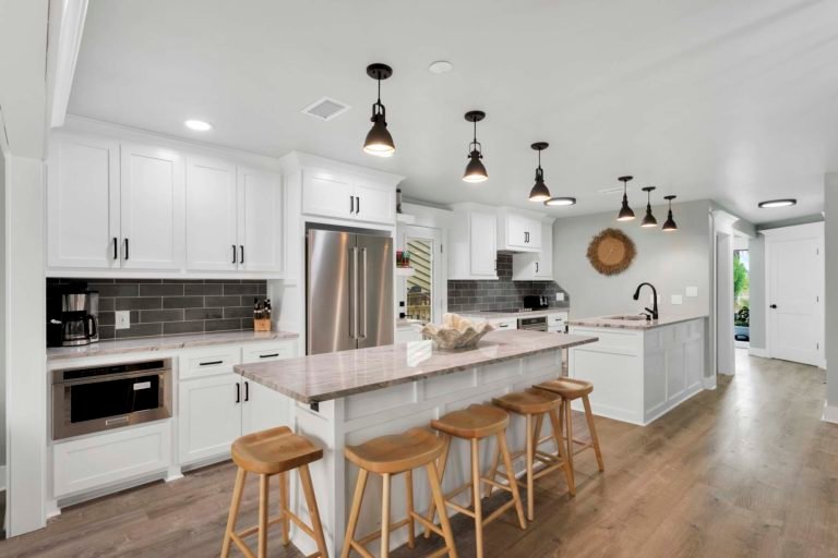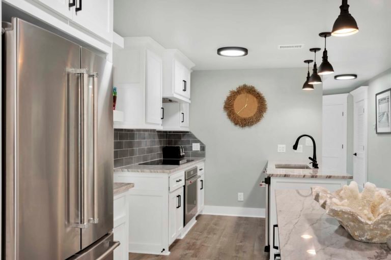 Ground Level – Full Kitchen, Spacious Living Room with 2 double futons, King bedroom, and Full Hall bathroom